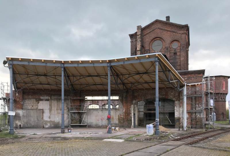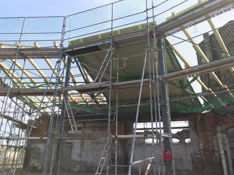 Obwohl die Arbeit pandemiebedingt nur sehr langsam vorangeht, freuen wir uns doch, ein paar sehenswerte Zwischenergebnisse präsentieren zu können. Erstens sind die Dacharbeiten an den Resten des Lokschuppens 1 nahezu abgeschlossen. Das Dach wurde in den letzten Tagen mittels einer Holzkonstruktion gedeckt und anschließend mit Dachpappe abgedichtet. Die Baugerüste sind weitgehend abgebaut. Lediglich an den Seiten werden in diesem Bauabschnitt noch ein paar kleine Restarbeiten durchgeführt.