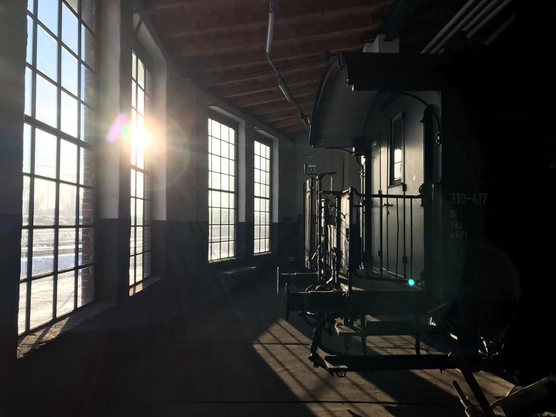 Auf dem ersten Bild scheint sie durch die rückwärtigen Fenster des Lokschuppens und streift den Personenwagen, der ab und zu für Rundfahrten im Gelände eingesetzt wird.