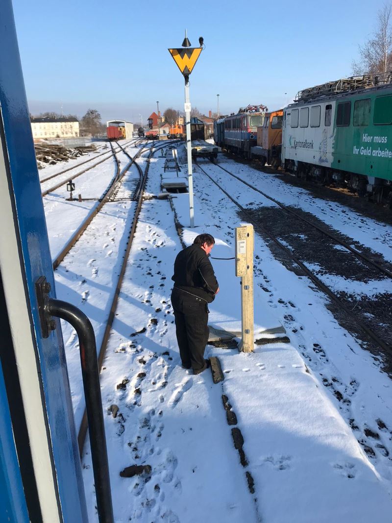 Da alle Weichen im Rangierbezirk der Magdeburger Seite vom Stellwerk Wm gestellt werden, muss sich der Rangierer über Telefon mit dem Stellwerker verständigen.