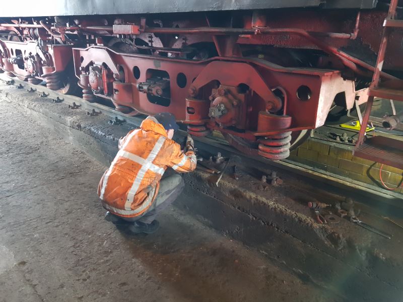 In der vergangenen Woche konnten wieder einige Arbeiten erledigt werden. So wurde das Bremsgestänge am Tender unserer Dampflok 50 3570 abgebaut, um einige bewegliche Teile aufzuarbeiten. Hier schaut der Kollege erst einmal, wie er am besten die Schrauben und Bolzen erreicht, die loszuschrauben sind.