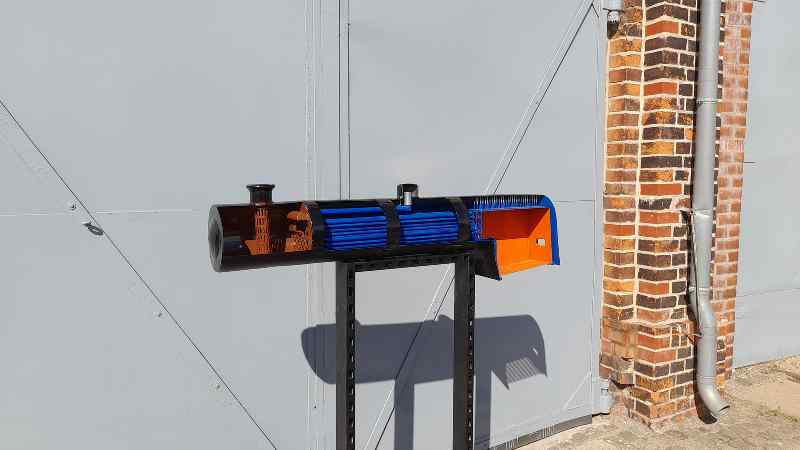 Dankenswerterweise hat ein Kollege in Heimarbeit ein Schnittmodell eines Dampflokkessels erstellt. Das Modell wurde nun lackiert und auf einen Ständer geschraubt. Es wird demnächst unsere Ausstellung bereichern. Gut zu erkennen sind unterschiedlich farbige Bereiche in seinem Inneren. Die Feuerbüchse ist orange lackiert, der wasserführende Raum blau und die Rauchkammer braun.