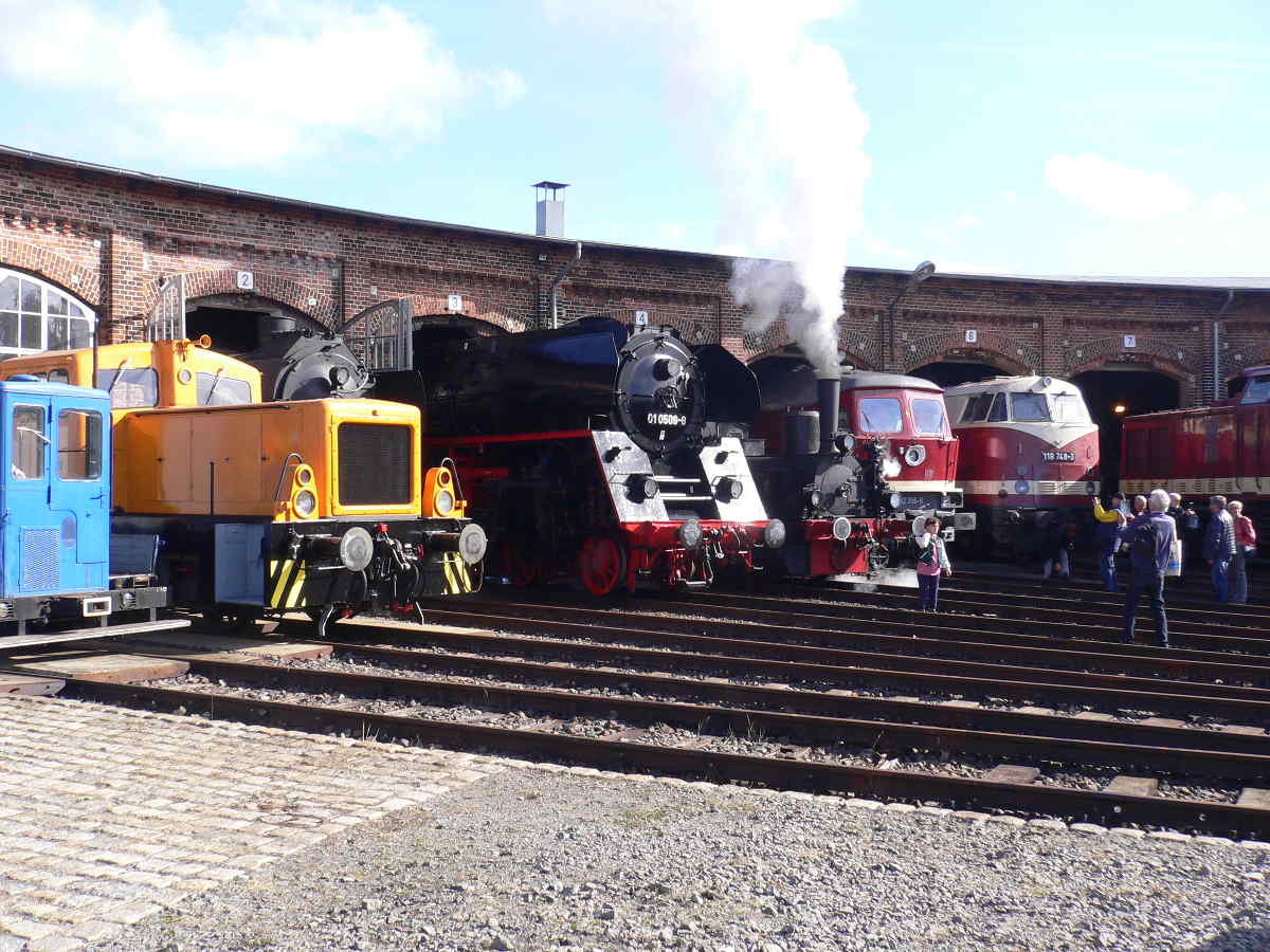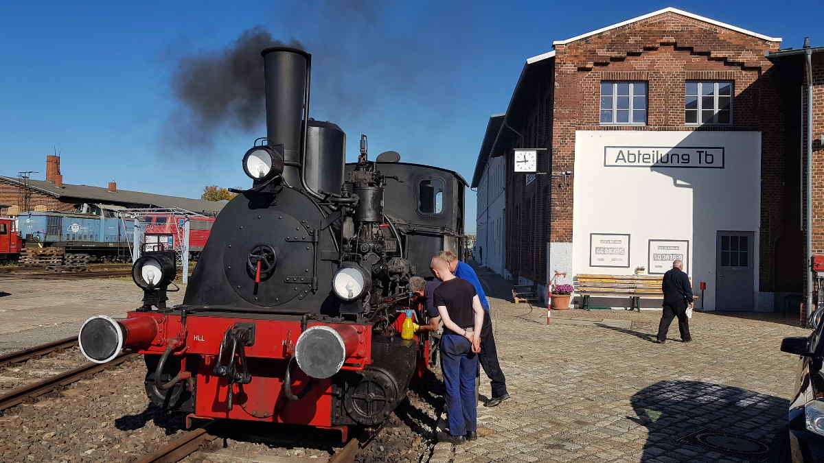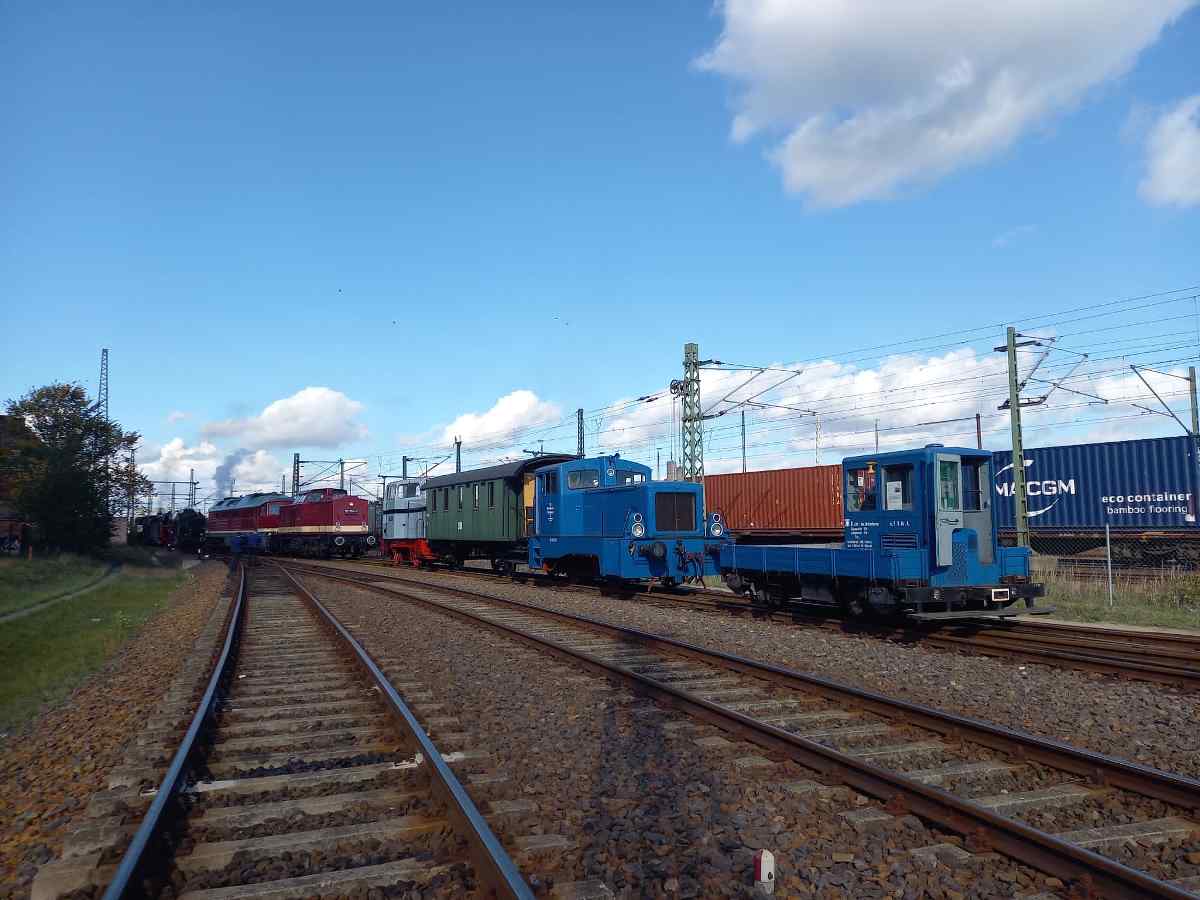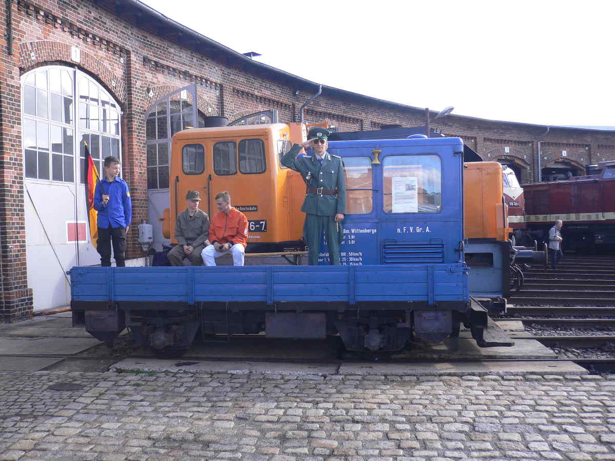 Nachdem nun alle Lokomotiven zum Leben erweckt worden und die Vorbereitungen soweit abgeschlossen waren, stieg die Vorfreude auf die kommenden beiden Tage. Am Samstag und Sonntag konnten wir sicher einige Highlights bieten. Dazu zählte natürlich die Anwesenheit unserer Gastlokomotiven, die sich abwechselnd auf der Drehscheibe präsentierten und auch an unseren Paradefahrten am Nachmittag teilnahmen. Nennenswert waren auch unsere Schienenexkursionen auf die Wittenberger Hafenbahn, die mit dem Triebwagen 672 910 der Hanseatischen Eisenbahn-Gesellschaft durchgeführt wurden. Abwechslungsreich war die Darbietung alter Uniformen aus DDR-Zeiten, die auf der Ladefläche unseres Schienenkleinlasters vorgestellt wurden. Und an die ganz Kleinen war auch gedacht: Hinter dem Lokschuppen verkehrte die Kindereisenbahn, die unseren Nachwuchs begeisterte. Hier einige Bilder, die an den beiden Tagen entstanden sind.