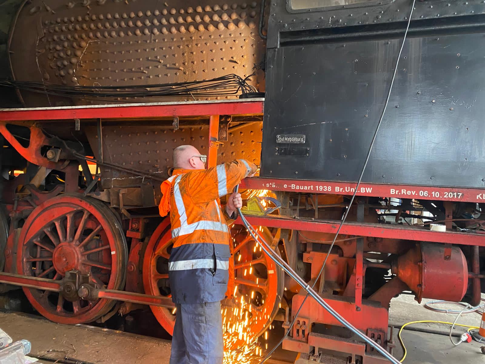 Bevor die Saison losgeht, haben wir ordentliche Fortschritte bei unserer Dampflok 50 3682 erzielt, die sich gerade in der Demontage befindet, damit sie einen neuen Kessel erhalten kann. Vorher muss allerdings noch das Führerhaus abgenommen werden, was gerade die Hauptaufgabe ist. Man glaubt gar nicht, wie viele Schrauben und Verbindungen zu lösen sind, damit das Führerhaus vom Rahmen und vom bisherigen Kessel getrennt werden kann. Etliche Schrauben waren dabei nicht mehr zu lösen. Also war der Schweißbrenner im Dauereinsatz, um sie durchzutrennen. Die angefügten Bilder zeigen den Einsatz der Kollegen.