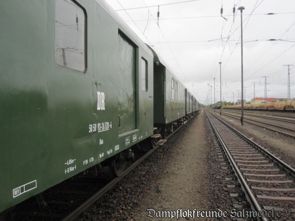 Zweiter Schwerpunkt war der Transport von Eisenbahnfahrzeugen über die Schiene. Für insgesamt 12 Wagen ging es von Salzwedel zunächst nach Stendal und nach einem Fahrtrichtungswechsel weiter nach Wittenberge. Leider ist die direkte Strecke zwischen Abfahrt- und Zielort über Arendsee nicht mehr betriebsfähig. Das folgende Bild zeigt einen Teil unseres Zuges beim Aufenthalt in Stendal.