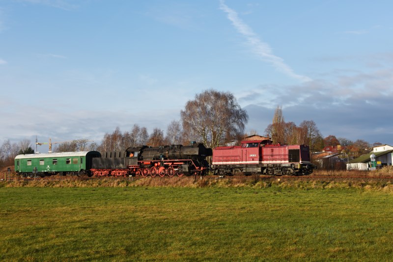 Am 10.12.2017 schickten wir sie daher im Schlepp einer Diesellok auf die Reise nach Neustrelitz, wo es eine sogenannte Unterflur-Radsatzdrehbank gibt. Hier wird die ganze Lok auf die Drehbank gefahren und ihre Räder werden im eingebauten Zustand von starken Elektromotoren der Drehbank gedreht. Dann wird ein Drehmeißel an die Räder gefahren und so lange Metallschichten von den Laufflächen der Räder abgetragen, bis das Profil wieder stimmt. Die Bilder zeigen die Überführung der Dampflok in Glashütte und Pritzwalk und das Video den Betrieb auf der Drehbank.