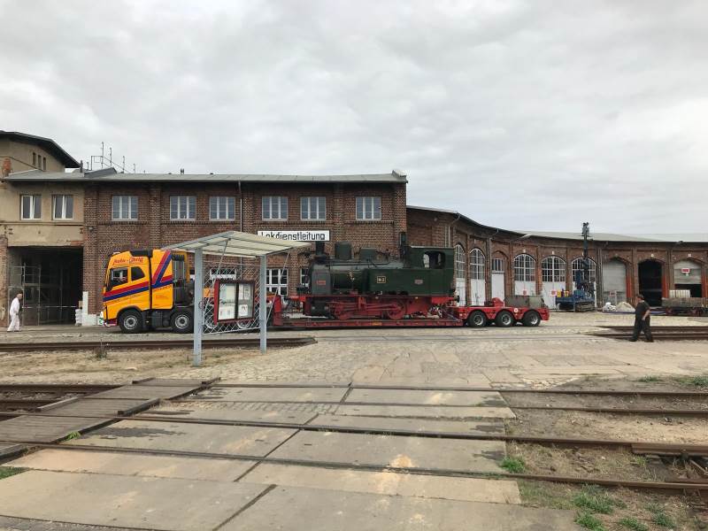 Auch in diesem Jahr ist unsere Dampflok "EMMA" auf der InnoTrans, der größten internationalen Fachmesse für Verkehrstechnik (18.–23.09.2018), in Berlin im Einsatz. Da die Maschine aus betriebstechnologischen Gründen nicht mit eigener Kraft überführt werden kann, wurde die Maschine am Donnerstag (13.09.2019) auf einen Spezialtieflader der in Schwarzenberg (Erzgebirge) ansässigen Spedition Arne Ehrig KG verladen und auf der Straße nach Berlin gebracht. Einen Tag später traf die Maschine wohlbehalten auf dem Messegelände am Berliner Funkturm ein. Am Montag (17.09.2018) wird "EMMA" von einigen Aktiven des "Historischen Lokschuppens Wittenberge" für den Einsatz auf der InnoTrans vorbereitet. Einen Tag später öffnet die Messe ihre Tore für das Fachpublikum. Die Besucher aus aller Welt haben dann die einmalige Möglichkeit, auf dem Führerstand einer historischen Dampflok mitzufahren. Am 22. und 23. September 2018 ist das Messegelände für alle großen und kleinen Eisenbahnfreunde geöffnet. Auch an diesen beiden Tagen steht "EMMA" unter Dampf. Anschließend wird die Maschine wieder mit einen Tieflader nach Wittenberge gebracht.