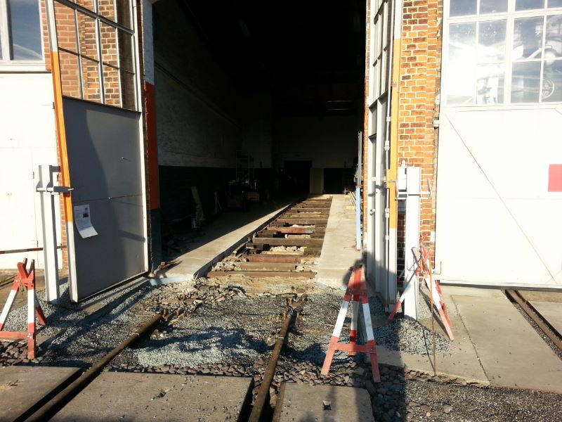 Die ersten Vorbereitungen auf die Reparatur des Gleises unter unserer Besandungsanlage wurden getroffen. Diese sind notwendig, weil die hier verbauten Holzschwellen langsam in die Jahre kommen und verrotten. Das führt leider dazu, dass die Abstände zwischen den Schienen nicht mehr dem geforderten Maß von 1.435 mm entsprechen. Das kann zum Entgleisen von Schienenfahrzeugen führen, die über die abgängigen Stellen fahren. Um die Sicherheit weiterhin zu gewährleisten, wird das Gleis ab Montag, den 18.2., aufgenommen und gebrauchte Betonschwellen eingesetzt. Auch wenn es sich nur um eine relativ kleine Baustelle handelt, muss jede Menge Technik aufgeboten werden, die bereits auf unser Gelände gebracht wurde.