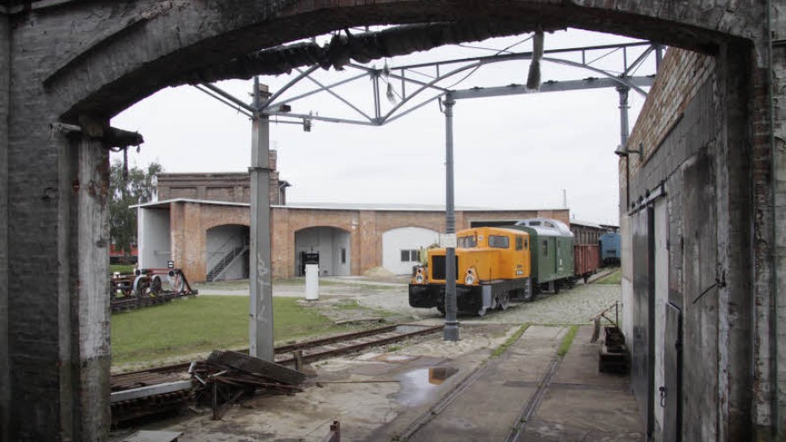 Noch sind die Reste des Lokschuppens 1 eher Ruine als Unterstand. Der runde, gepflasterte Bereich unter der orangenen Lok war einst die Drehscheibe. |