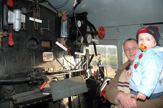 Thomas Kötke aus Böddenstedt untersuchte mit Sohn Martin (2) die faszinierende Technik im Führerstand der 65 Jahre alten Lok 50-3624.