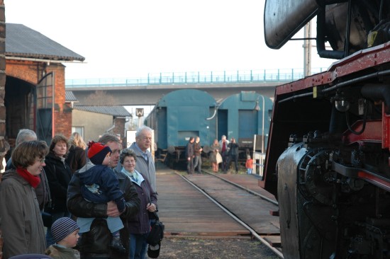 Hier konnten die Gäste sich stärken, Souvenirs kaufen, die kleine Ausstellung zur Historie des alten Bahnbetriebswerkes anschauen oder in die offene Rauchkammer der Dampflok 50-3570 schauen. Seit Juli wird das 1942 erbaute Dampfross, das seit vier Jahren im Lokschuppen steht, aufgemöbelt. Ziel ist es, sie wieder in Betrieb zu setzen. Dann wird sie sicherlich ebenso viele Blicke auf sich ziehen wie am Wochenende ihre aufpolierte Schwester 50-3624.