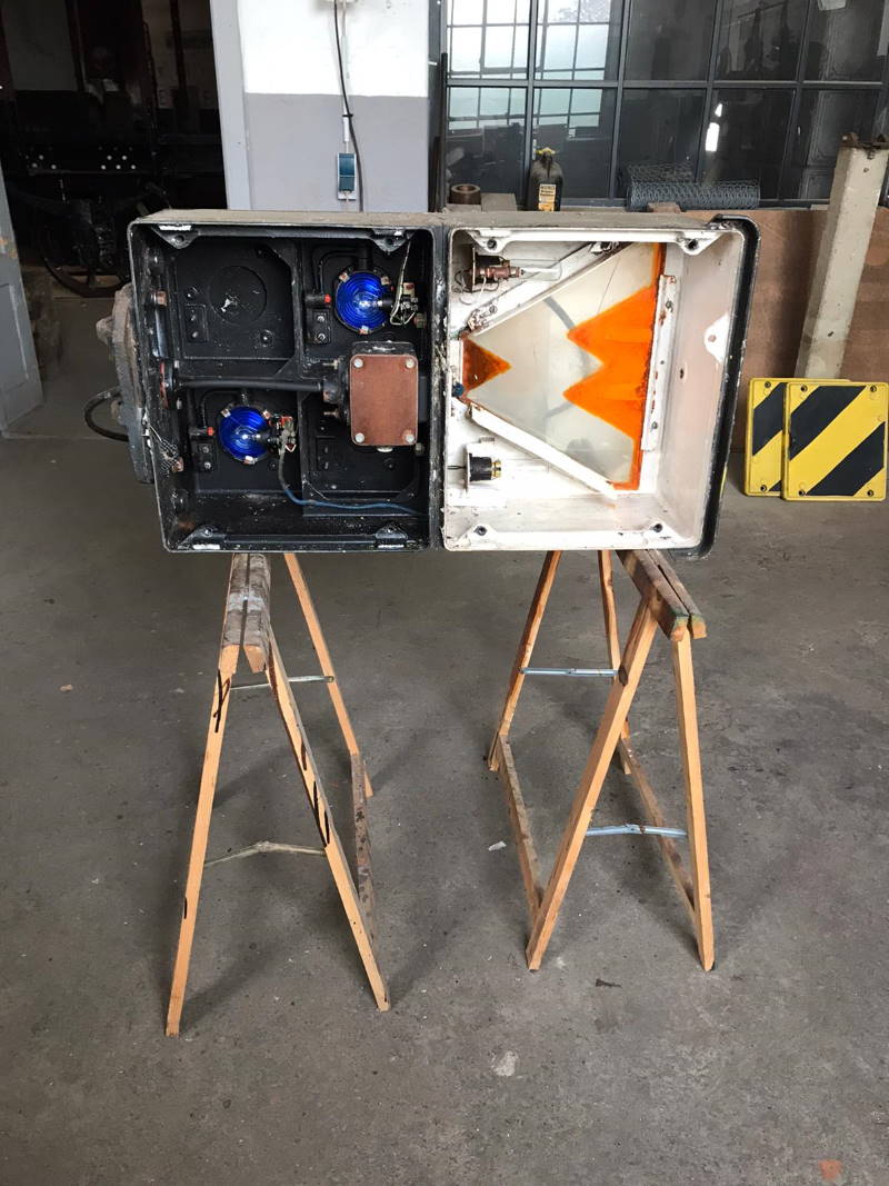 Unsere Elektriker haben sich inzwischen auch dem neuen Rangiersignal angenommen, das demnächst im unserem Gleisfeld in Betrieb genommen werden soll. Vorher müssen allerdings die Kabel, die Lampen und die Steuerung überprüft werden. Außerdem muss das „W“ wieder transparente orange Farbe erhalten. Das W bedeutet übrigens „Warten“. Erst wenn es aufleuchtet, darf eine Rangierfahrt an dem Signal vorbeifahren. Das Signal wird von unserem Stellwerk Wm bedient werden.