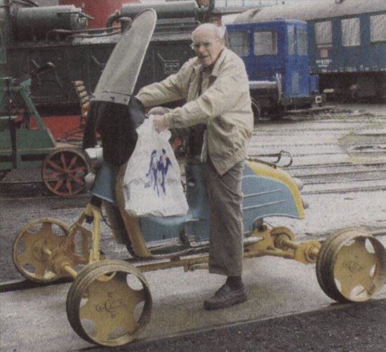 Ein Moped auf Schienen: Erich Graf aus Klötze beim Probesitzen.